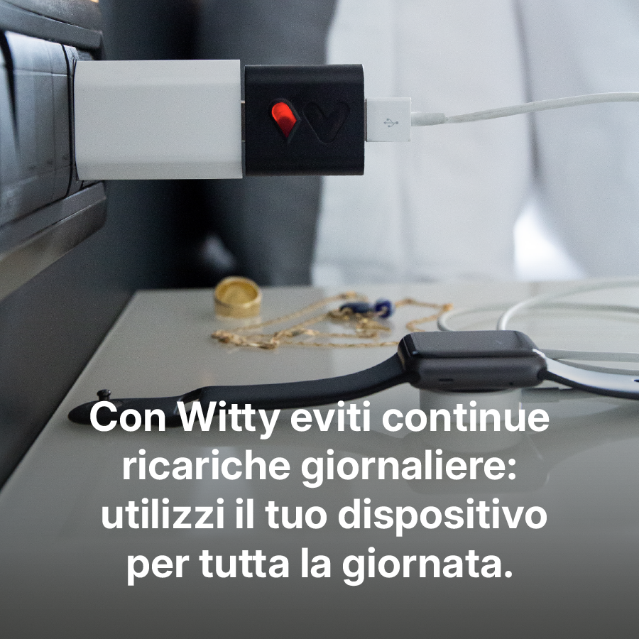 È possibile utilizzare Witty anche nel caso si avesse un USB di tipo C grazie a dei piccoli adattatori che convertano l’USB di tipo C nel classico USB tipo A o, caricando il dispositivo con un caricabatterie da 5V. Gli adattatori USB di tipo C sono disponibili sul nostro store.